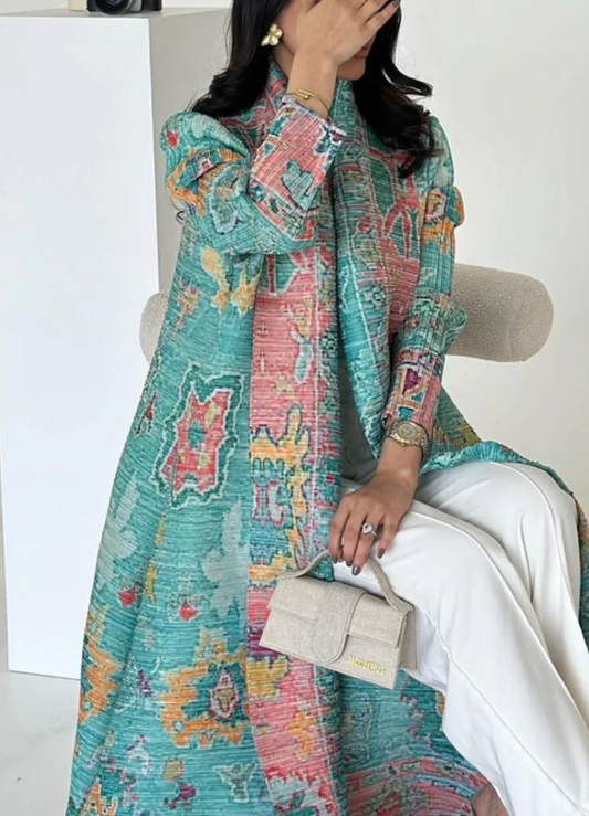 The rich tones of a green abaya with beads evoke a sense of regal sophistication. Embellished details amplify its luxurious appeal, making it a standout choice for celebrations and evening gatherings.